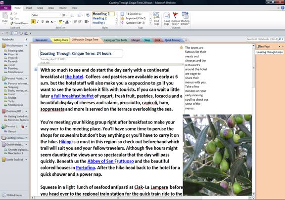 Begin with research. With only 24 hours in the Cinque Terre I wanted to take advantage of the best of the Italian Riviera…I chose to concentrate on hiking, eating the local foods and sampling the wines. I used the research function to access websites, blogs, tour companies, restaurant reviews, hotel rates and simply inserted pictures, screen shots and general info. Because you can type anywhere on the page in OneNote you can easily jot down notes so you won’t miss anything. And Tags let you easily add lists and follow up functions like addresses, photo numbers, and contacts to your TripBook. Tags also help with prioritizing and remembering important info!